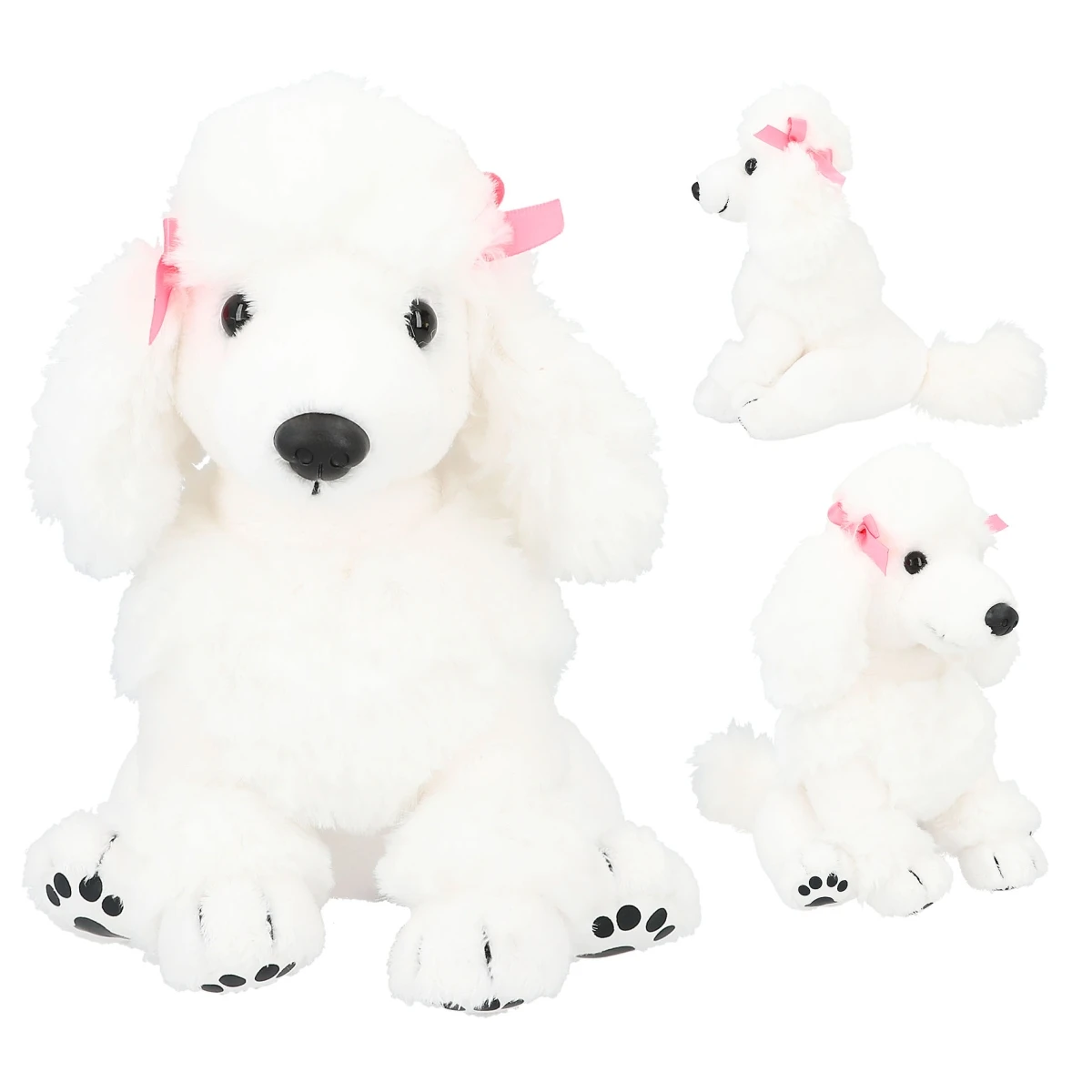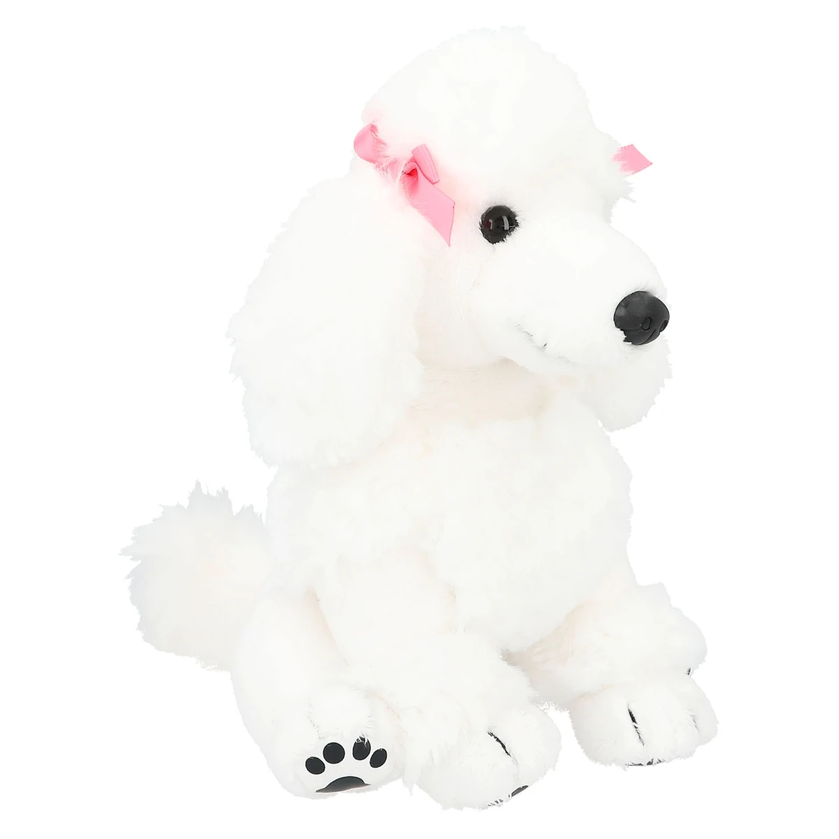 Der weiße Plüsch-Pudel Chanel hat schwarze Knopfaugen und an jedem Ohr ein rosa Schleifchen.