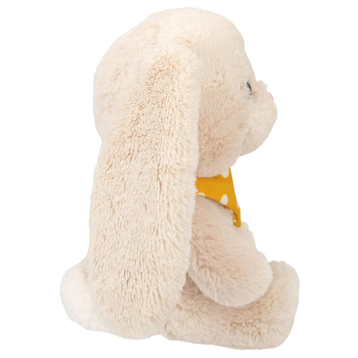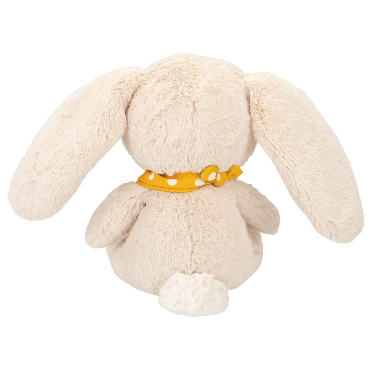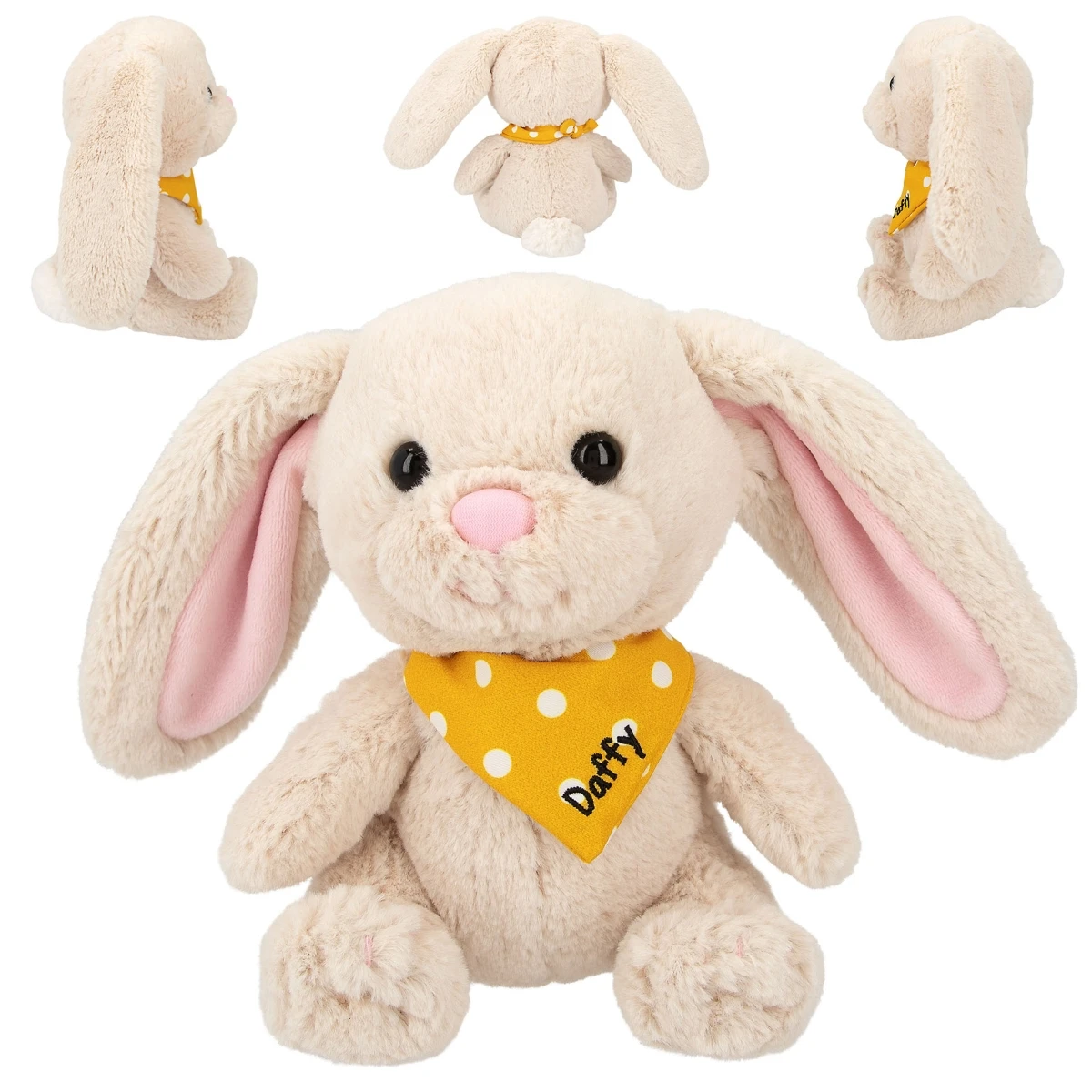 Supersüß und kuschelig weich: Der Snukis Plüsch-Hase Daffy in sanftem Beige hat treue schwarze Knopfaugen und trägt ein Halstuch mit Namensstickerei.