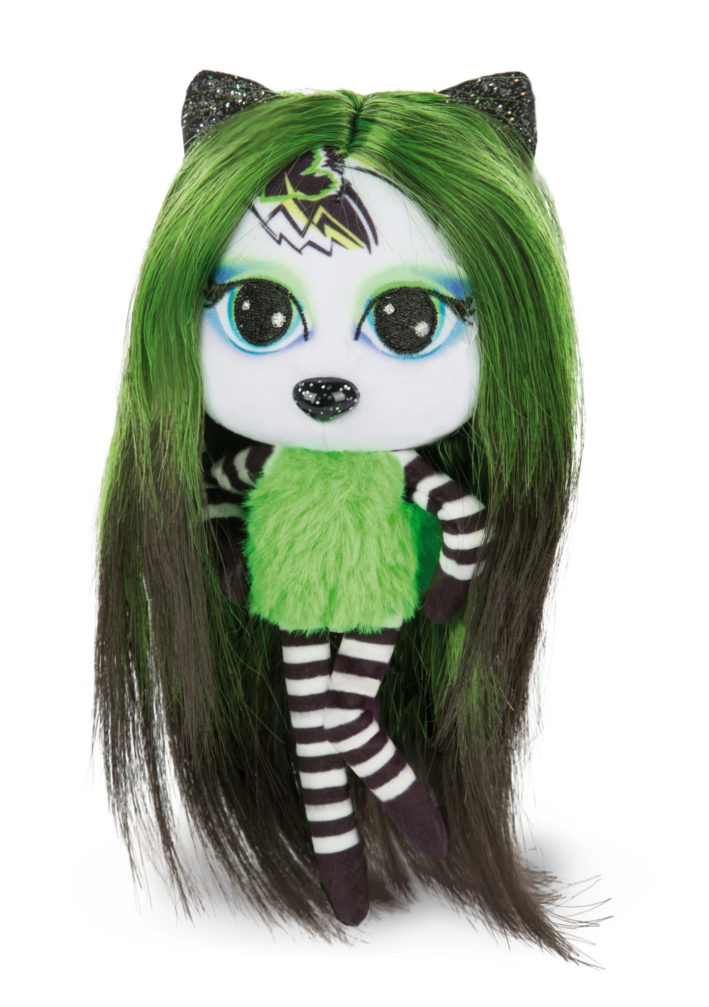 Zu der 20cm großen Puppe aus Plüsch mit den großen aufgestickten Augen, glitzernden Ohren und glitzernder Nase aus Kunststoff gibt es einen Kamm, passende Tattoos sowie ein Armbändchen.