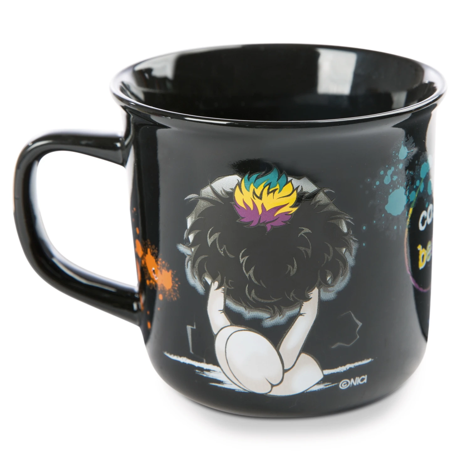 schwarze Tasse aus Porzellan mit bunter Botschaft