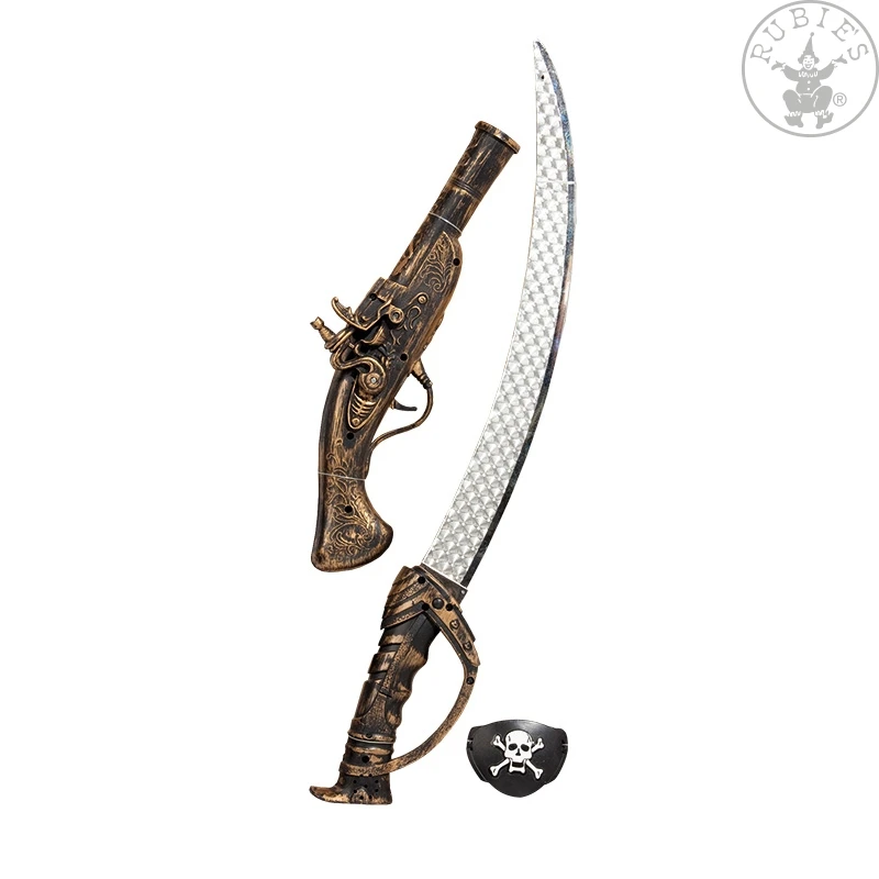 Dreiteiliges Piraten-Set bestehend aus einer schwarzen Augenklappe mit Gummiband und einem aufgedruckten Totenkopfemblem, sowie einem Säbel und einer Pistole im antiken Stil mit kunstvollen Verzierungen. Der Säbel hat eine silberne Klinge und ein kupferfarbenes Heft.